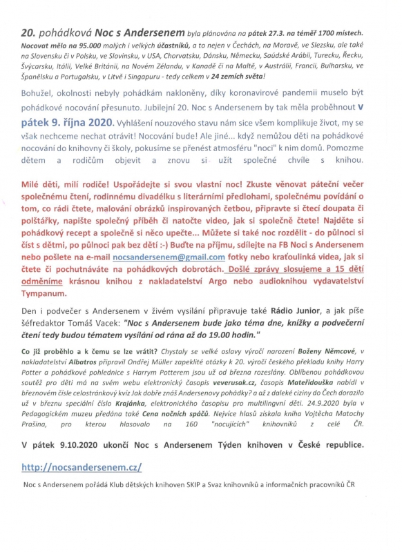 Co již proběhlo a k čemu se lze vrátit? Chystaly se velké oslavy výročí narození Boženy Němcové, v nakladatelství Albatros připravil Ondřej Müller zapeklité otázky k 20. výročí českého překladu knihy Harry Potter a pohádkové pohlednice s Harrym Potterem jsou už od března rozeslány. Oblíbenou pohádkovou soutěž pro děti má na svém webu elektronický časopis veverusak.cz, časopis Mateřídouška nabídl v březnovém čísle celostránkový kvíz Jak dobře znáš Andersenovy pohádky? a až z daleké ciziny do Čech dorazilo už v březnu speciální číslo Krajánka, elektronického časopisu pro multilingvní děti. 24.9.2020 byla v Pedagogickém muzeu předána také Cena nočních spáčů. Nejvíce hlasů získala kniha Vojtěcha Matochy Prašina, pro kterou hlasovalo na 160 "nocujících" knihovníků z celé ČR.