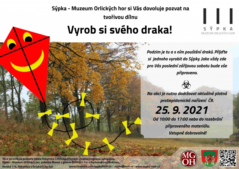 Muzeum a galerie Orlických hor v Rychnově nad Kněžnou Vás srdečně zveme v sobotu 25. září 2021 od 10 do 17 hodin do Sýpky – Muzea Orlických hor na tradiční tvořivou dílnu na téma „Vyrob si svého draka“. Podzim je tu a s ním i pouštění draků. Přijďte si jednoho takového vyrobit do Sýpky. Nemusíte si nic nosit, vše pro Vás bude připraveno. Vstupné dobrovolné. Akce proběhne za dodržení protiepidemických nařízeních o kulturních akcích.