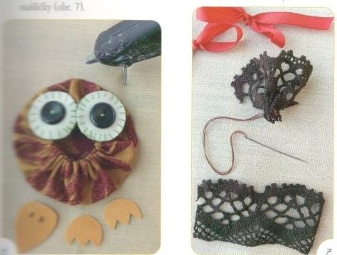 Pomůcky: dostatečně pevná látka, dva větší knoflíky, kousek bílé a oranžové kkoženky, dva kousky krajky, dva kousky stužky, peří, jehla, nit, bavlnka, nůžky, tužka , talířek, cca 20 cm, kružítko, tavná pistole