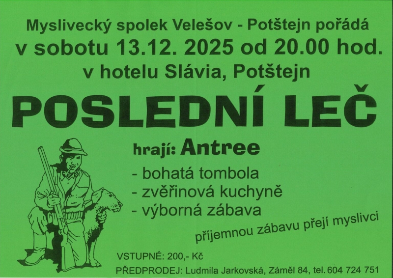 Myslivecký spoleck Velešov - Potštejn vás zve v sobotu 13.12.2025 od 20.00 hodin na Poslední leč.