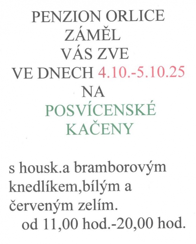 Posvícenské kačeny ve dnech 4. - 5. 10. od 11:00 - 20:00 hod. Penzion Orlice Záměl