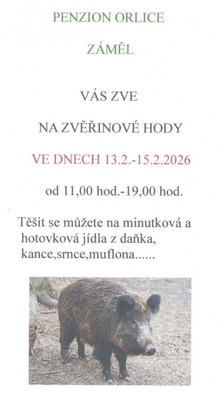 Zvěřinové hody v penzionu Orlice 13.2. - 15.2.2026 od 11:00 - 19:00 hod.